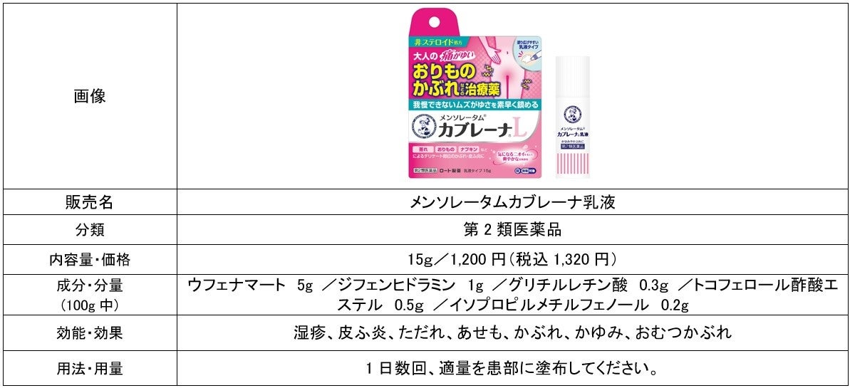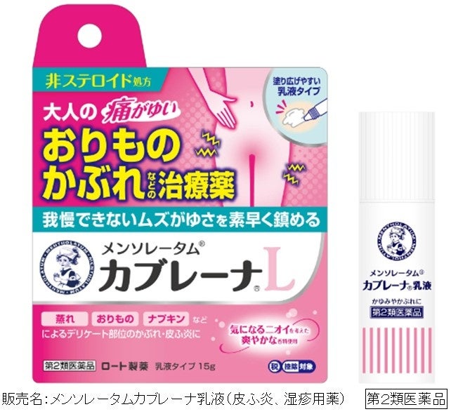 ロート製薬株式会社(本社:大阪市、社長:杉本雅史)は、大人の痛がゆい“おりもの”などによる、かぶれ・かゆみに着目した皮膚用薬「メンソレータムカブレーナ乳液」を2023 年3月20日(月)より全国の薬局・薬店にて新発売いたします。デリケート部位におけるさまざまな悩みにおいて、“おりもの”によるかぶれ・かゆみは深刻な悩みの一つです。そこで、おりものの特性や症状に合わせ、効果や使い勝手を追究した処方を実現しました。つらい症状を治し、また気になるニオイのことを考えた香料を配合し、快適にお使いいただけます。今後も女性の繊細な悩みに寄り添いながら、より良い商品開発・提案を続けてまいります。