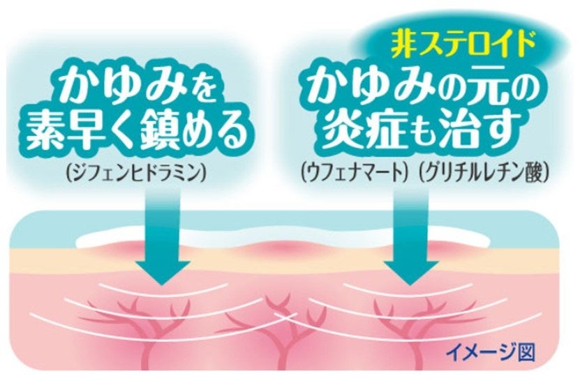 かゆみを素早く鎮める「ジフェンヒドラミン」と、かゆみの元の炎症を治す有効成分「ウフェナマート」と「グリチルレチン酸」を配合し、症状にW のアプローチ。