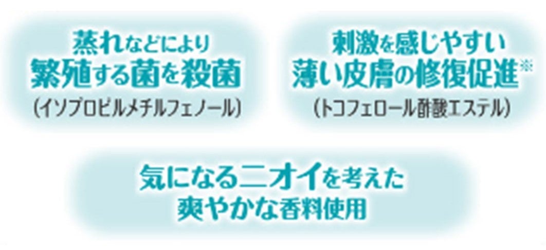 おりもの中での雑菌繁殖にも効果的な「イソプロピルメチル フェノール」を配合。おりものの特性の一つである酸性の環境でも、安定的に殺菌効果を発揮します。刺激を感じやすい薄い皮膚の修復促進には「トコフェロール酢酸エステル」が作用。同時に、気になるおりもののニオイにも配慮し、爽やかな香料を採用しました。小まめなケアが難しい部位だからこそ、快適に過ごせる処方を追究しています。 非ステロイド、すっと塗り伸ばしやすい乳液タイプです。