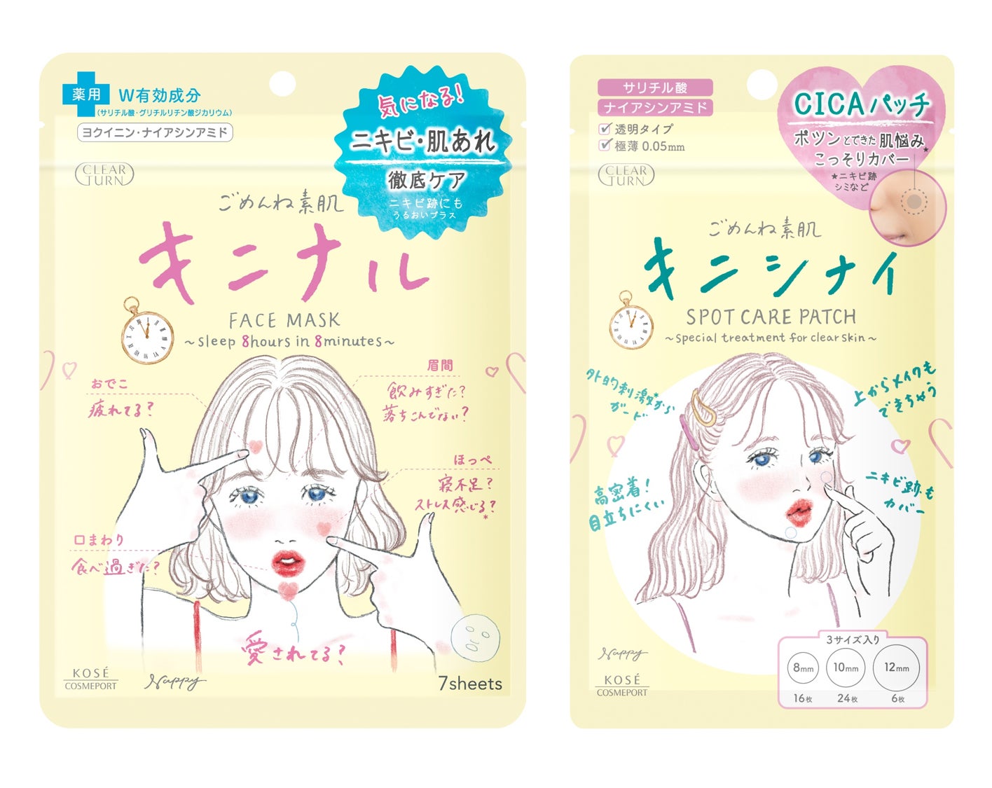 コーセーコスメポート株式会社(本社:東京都中央区、代表取締役社長:小林 孝雄)は、スキンケアブランド『クリアターン』において、人気のイラストレーターのNAPPYさんとコラボレーションした、敏感・肌あれケアタシリーズ「ごめんね素肌」よりニキビ・肌あれをケアする「キニナルマスク」【医薬部外品】、出来てしまったトラブルスポット※1をカバーして乾燥や摩擦などの外的刺激からまもる「キニシナイパッチ」(2品目2品種、ノープリントプライス)を2023年4月7日より全国の量販店・ドラッグストアを中心に発売します。