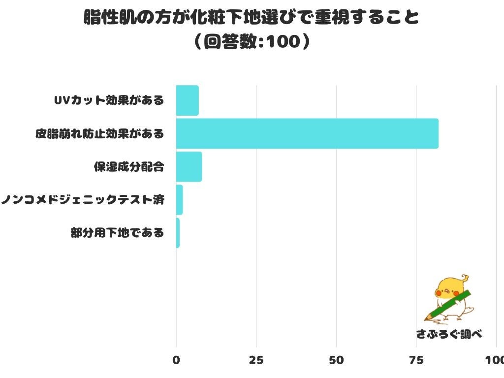 脂性肌の方が化粧下地選びで重視することをアンケートにて調査したところ、1位は「皮脂崩れ防止効果がある」 でした。