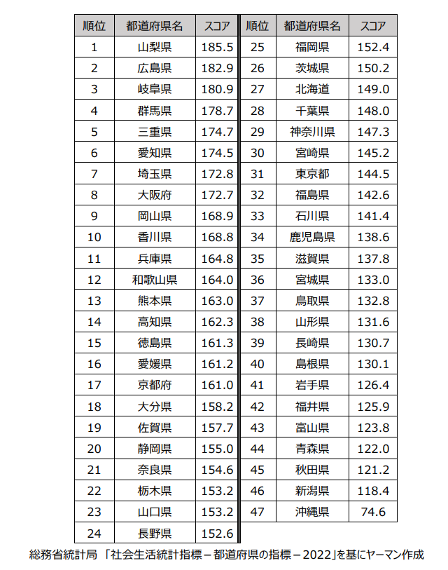 最後は総合部門です。総合部門では、前出の「湿度」「寒暖差」「日照時間」の3つの項目の標準偏差を出し、そのスコアの合計でランキングを作成しました。複合的な要因が重なることで、肌へのダメージも大きくなってしまいます。スコアが高い都道府県ほど、肌にとっては注意が必要な環境であるといえますが、果たして1位はどこだったのでしょうか。