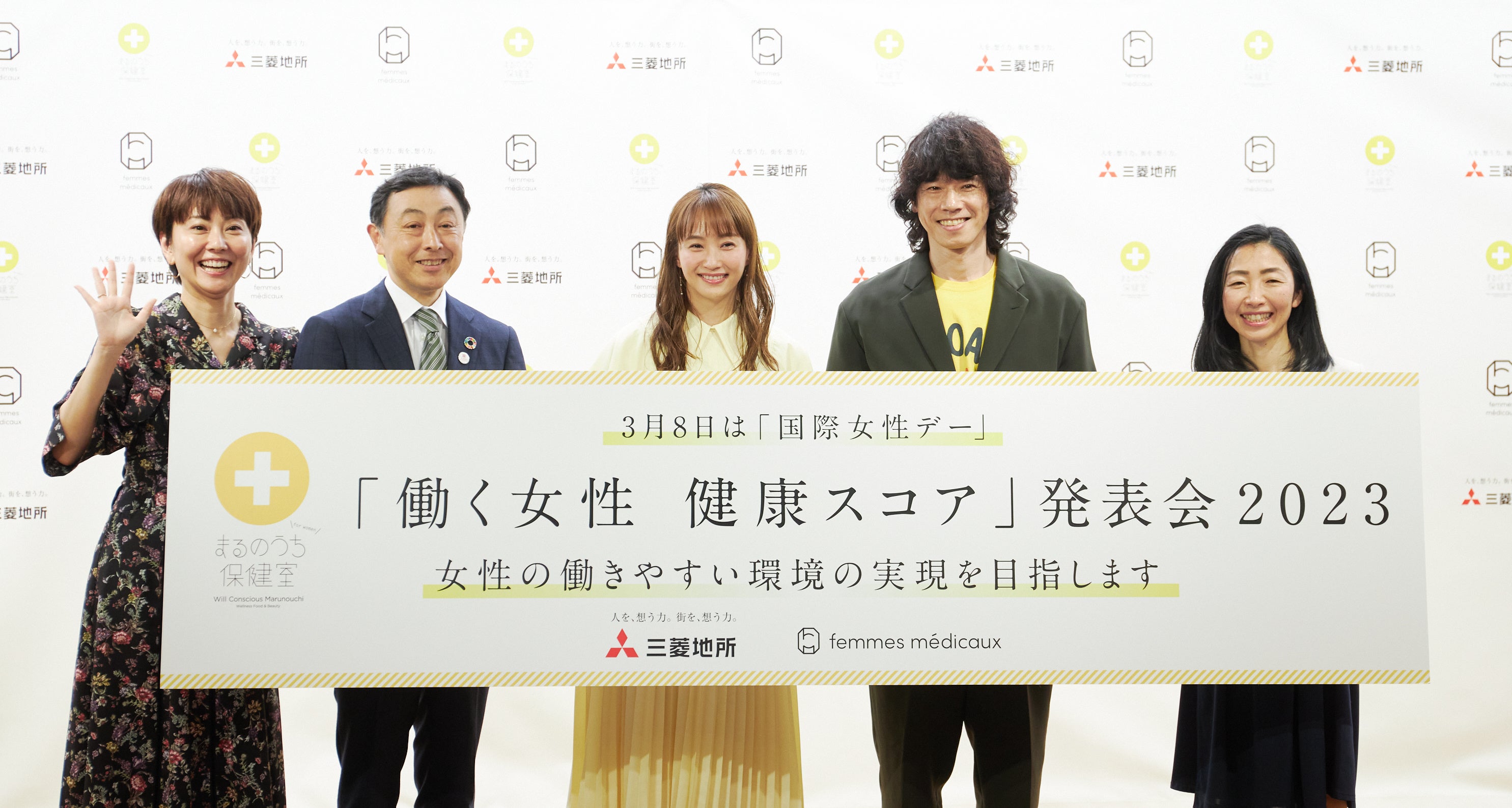 三菱地所は、働く女性※1の未来の姿に寄り添うプロジェクト「Will Conscious Marunouchi※2」(以下、WCM)の一環として「まるのうち保健室※3」を推進しています。産学医連携プロジェクト「働く女性 健康スコア」は、現代女性の健康問題解決など女性医療コンサルティングを展開するファムメディコと三菱地所との共催により、業種の異なる14社とともに、⼥性従業員を取り巻く健康や就業環境などについて可視化する取り組みです。神奈川県⽴保健福祉⼤学の協⼒のもと、疫学調査をベースとした調査項⽬を開発し、参画企業の⼈事部を介して約3,400名が回答しています。イベントでは、この結果を「働く女性 健康スコア」として公開したほか、特別ゲストとして庄司智春さんと藤本美貴さんご夫婦をお招きし、働く女性の健康についてトークセッションを行いました。