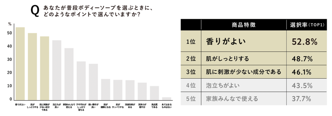 さらに、開発時にボディーソープにおけるニーズ調査[*4]を行ったところ、 「香りが良いこと」「肌がしっとりすること」「肌に刺激がないこと」 が重要視されていることが分かりました。