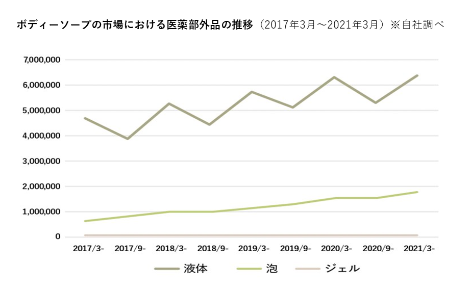 ボディーソープの市場において、「医薬部外品」が17年比で154%[*2]と伸長しており、 コロナ禍での環境変化によるストレスやマスクの着用による肌トラブルを抱える消費者も増え、今後も、スキンケアとボディーケアを中心とした敏感肌商品の市場の拡大が見込まれます。