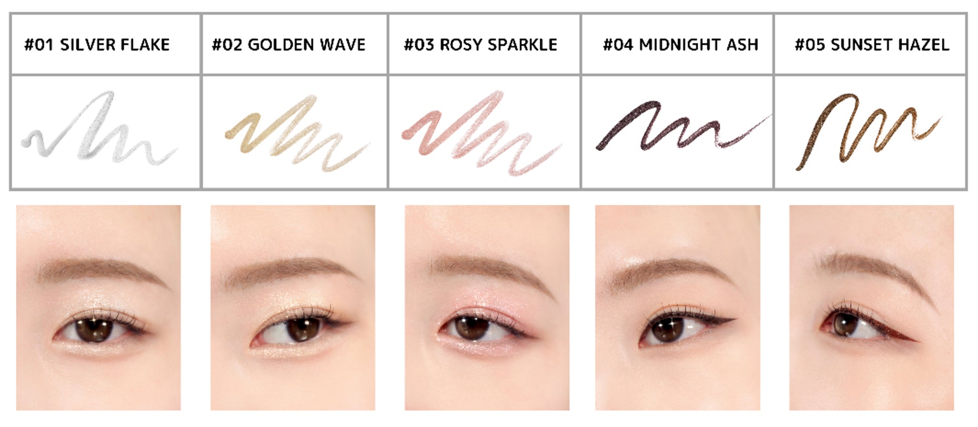 極細タッチで思いのままにするすると描けるリキッドパールライナーです。高密着でよれにくく、キラキラとした輝きをキープします。抜け感のあるベースカラーに繊細なパールが入った5色展開で、艶やかで印象的な目元に仕上げます。
