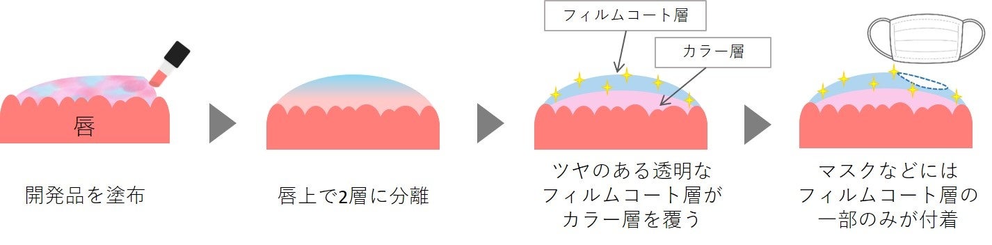 これまでのラスティング効果をかなえる技術は、粉体を高配合して付着性を上げたり、皮膜形成剤により塗布膜全体に強靭さを与えるものが多かったため、不透明でマットな膜になりやすく、ツヤを出すのが難しいという課題がありました。そこで今回、口紅製剤が唇上で色味のある「カラー層」とそれを覆うツヤのある「フィルムコート層」に分離し、ツヤと色の両方を持続させる口紅製造技術を開発しました。このフィルムコート層は透明でツヤ高い設計が可能であり、カラー層を厚く覆うように存在するため、マスクなどにはフィルムコート層の一部のみが付着することになり、ツヤと色の仕上がりを持続させることができます (図2)。