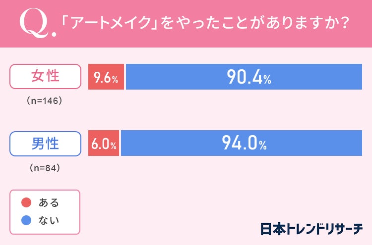 女性の9.6%、男性の6.0%、平均して8.3%が、アートメイクをしたことが「ある」と回答しました。