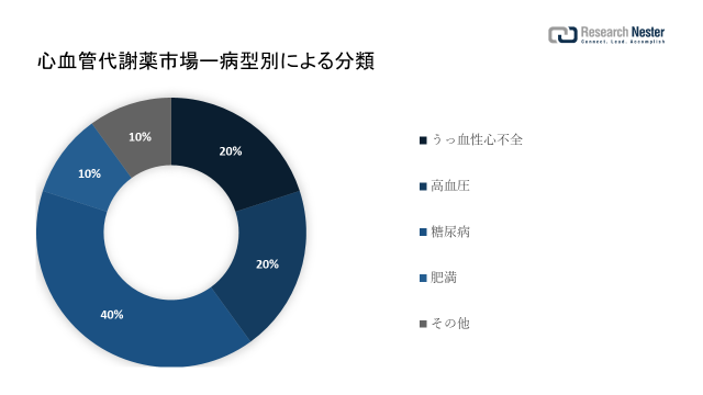 病型に基づいて、糖尿病セグメントは、予測期間中に市場で最大のシェアを保持することに起因しています。セグメントの成長に起因する主な要因は、ジャンクの消費の増加と不健康なライフスタイルの採用により、人々の間で糖尿病の症例が増加し、糖尿病の先天性発生が増加していることです。国際糖尿病連合 (IDF) が 2021 年に発表したデータによると、20 歳から 79 歳までの約537百万人が糖尿病を患っており、予測期間中に 783百 万人に達すると推定されています。さらに、フェイスペースのライフスタイルへの従事の結果としてのストレスと高血圧の例も、人口の中で糖尿病の成長を促進しており、最終的には治療プロセスのための心臓代謝薬の需要を生み出しています。