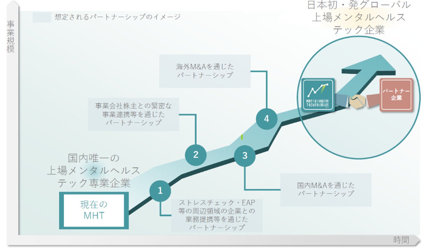 本パートナーシップは、当社IR資料上で提唱している「柔軟な”パートナーシップ”の活用により目指す成長のイメージ」内の「事業会社株主との緊密な事業連携等を通じたパートナーシップ」戦略の一環です。今後も、柔軟な”パートナーシップ”を通じて健康経営や人的資本経営等の概念に包含される職場環境の改善にパートナー企業と共に真摯に取り組み『国内唯一の上場メンタルヘルステック企業』から『日本初・発 グローバル上場メンタルヘルステック企業』を目指し成長を加速していきます。
