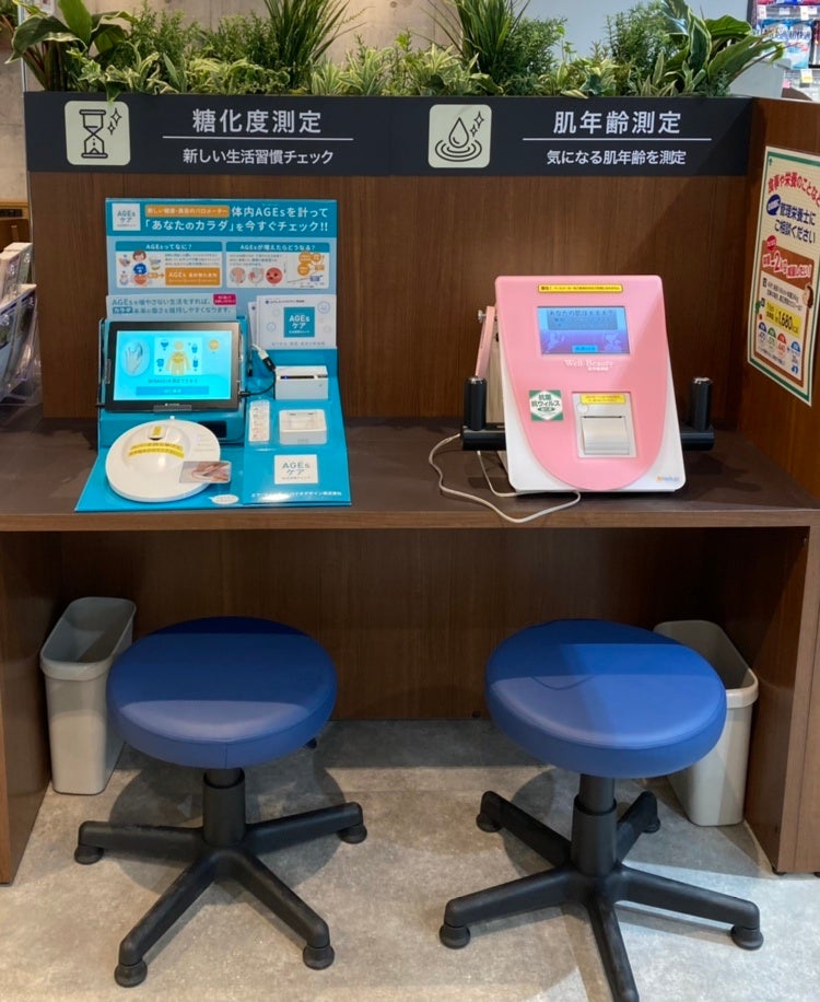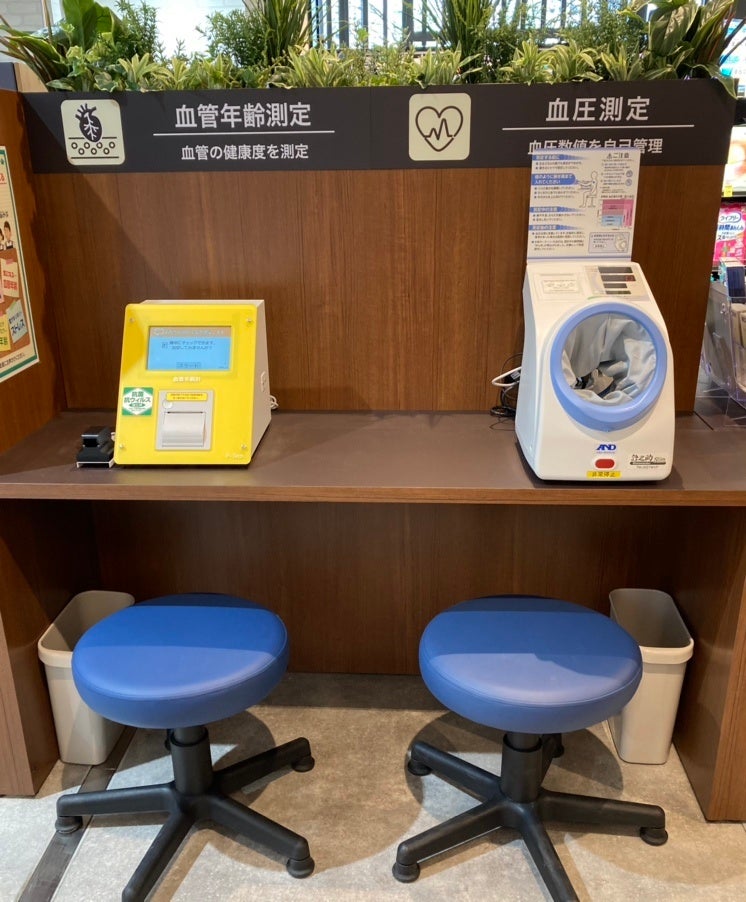 店内のヘルスケアコーナーでは、血圧、血管年齢、骨健康度など6種類の測定機器を設置しており、ご来店のお客様は無料でご利用いただけます。どうぞお気軽にご利用ください。