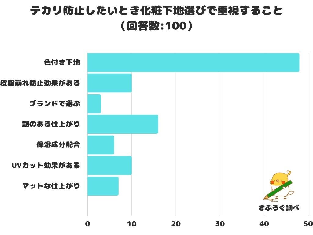 ・水分不足になると肌の水分と油分のバランスが崩れて皮脂が出てしまうと聞いたことがあるので、保湿成分が配合されている下地で肌の状態を整えることがテカり防止につながると思うので。(女性30代)