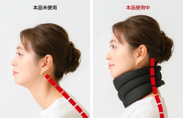 スマホやパソコンの使用、新幹線や飛行機の移動などが原因で首に負担を感じる方や、猫背に悩む方のための首サポーターです。
