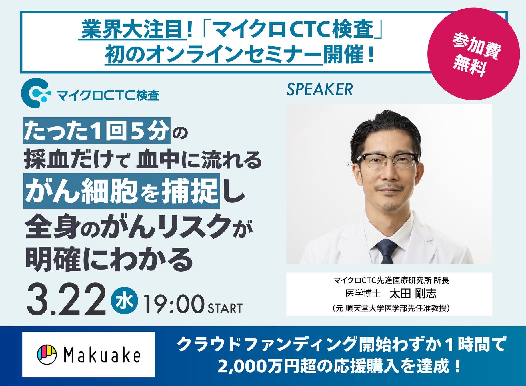 株式会社セルクラウドは、3月1日より応援購入サイト「Makuake」にて先行販売を開始した『マイクロCTC検査』サービスの一般向け説明会を3月22日(水)19:00より開催いたします。