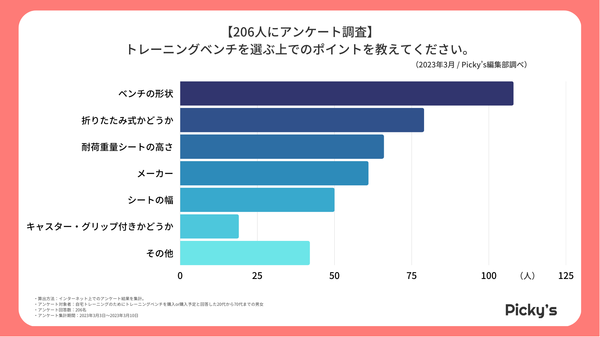 「その他」と答えた42名の方に、トレーニングベンチを選ぶときのポイントを質問したところ、「価格」や「コスパ」と答えた方がほとんどでしたが、「シート面の品質」(中部地方在住 60代男性)、「使用上の安全性と価格」(四国在住 20代男性)、「耐久性・安定感」(中国地方在住 30代男性)といった品質・安全性・耐久性を求める回答もありました。