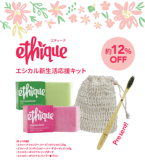 期間中は、今話題の天然由来成分100%のサスティナブルシャンプーバー「ethique(エティーク)」をお得に試せる限定キットを発売いたします。