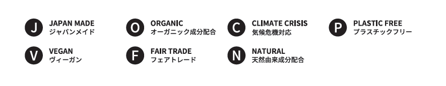 Ethical&SEA のどの商品がどんなエシカル消費に繋がっているのかを、わかりやすくアイコンで表記し、一目で判別できるようにしています。