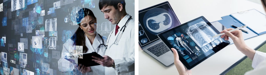 現在、医療現場では、疾病の診断や治療方針の決定、手術後のフォローアップ等様々な場面で医用画像が利用されています。一方、人々の健康意識の高まりや撮影装置の技術革新に伴い、医用画像が増え、診断を行う医師の負担が増加していることが医師の働き方改革推進上の課題となっており、課題解決に向けたデジタル技術の活用や医療連携が急務となっています。