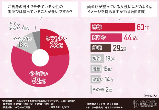 そこで、「ご自身の周りでモテている女性の歯並びは整っていることが多いですか?」と質問したところ、『とても多い(23.1%)』『やや多い(58.7%)』『やや少ない(13.3%)』『とても少ない(4.9%)』