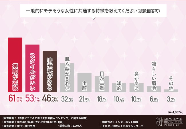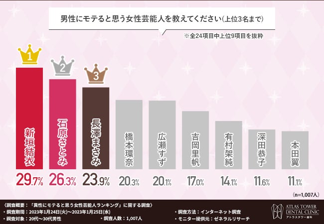 医療法人社団山手会 アトラスタワーデンタルクリニック (本社所在地:東京都目黒区、理事長:藤田 博紀)は、20代~30代男性を対象に、「異性にモテると思う女性芸能人ランキング」に関する調査を実施しました。