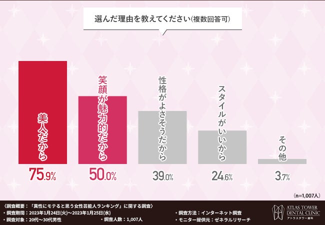 そこで、「選んだ理由を教えてください(複数回答可)」と質問したところ、『美人だから(75.9%)』