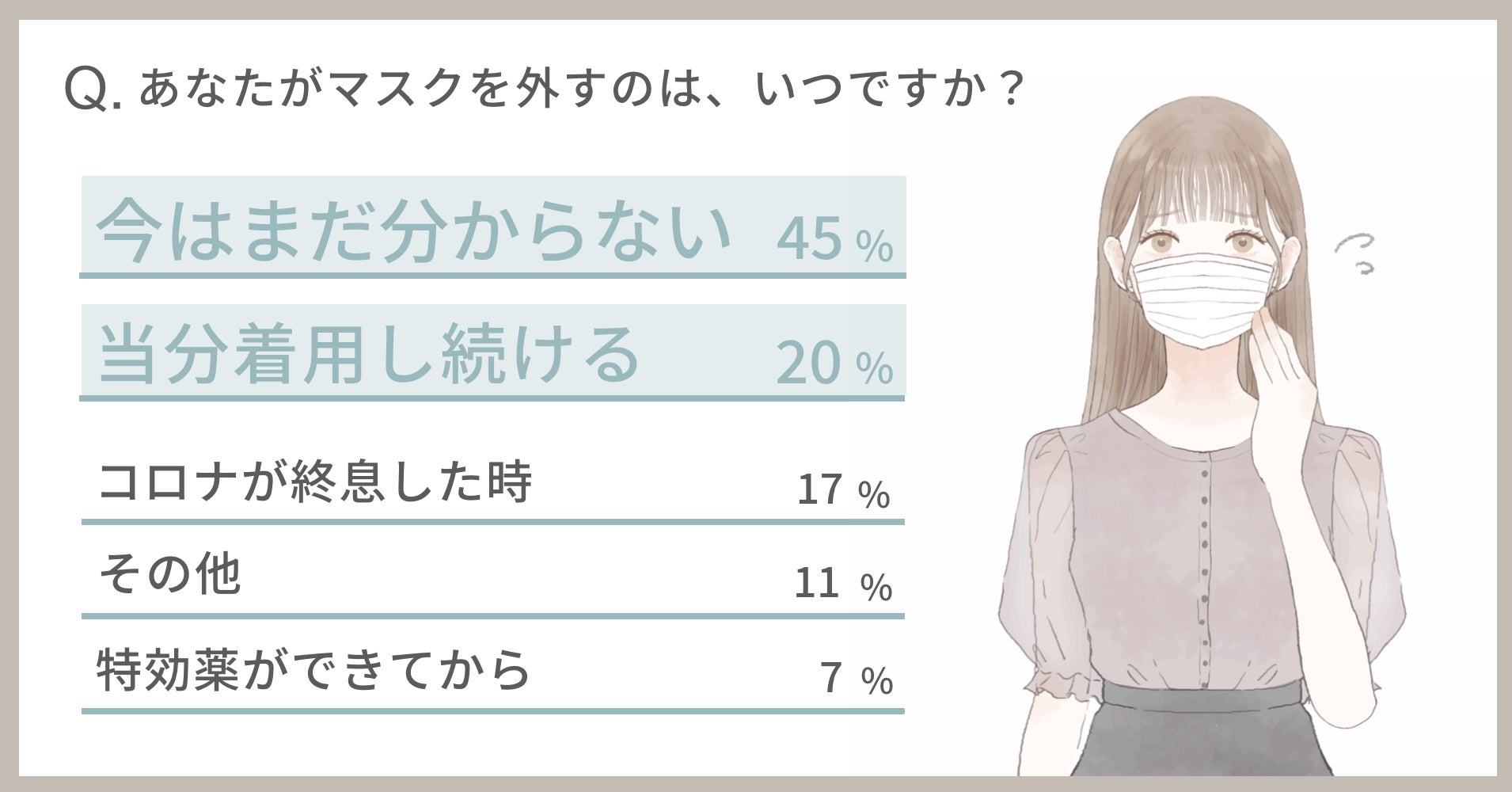 「あなたがマスクを外すのは、いつですか?」とお尋ねしたところ、最も多かったのは「まだ分からない」の45%。「当分着用し続ける」20%、「コロナが終息した時」17%、「その他」11%、「特効薬ができてから」7%と続きました。