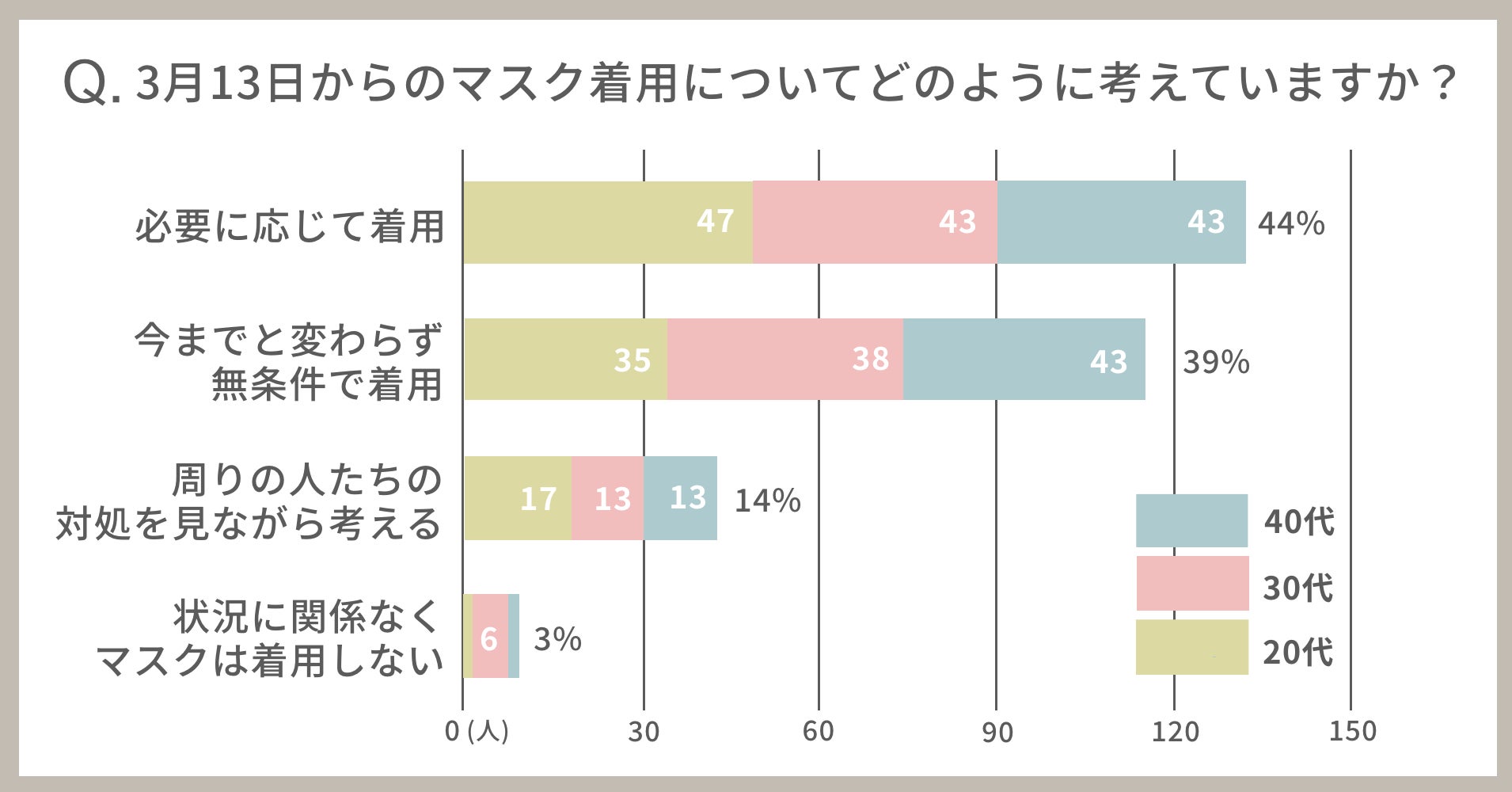 アンケートで「3月13日からのマスク着用についてどのように考えていますか?」とお尋ねしたところ、各世代で最も多かった回答は「必要に応じて着用する」でした。