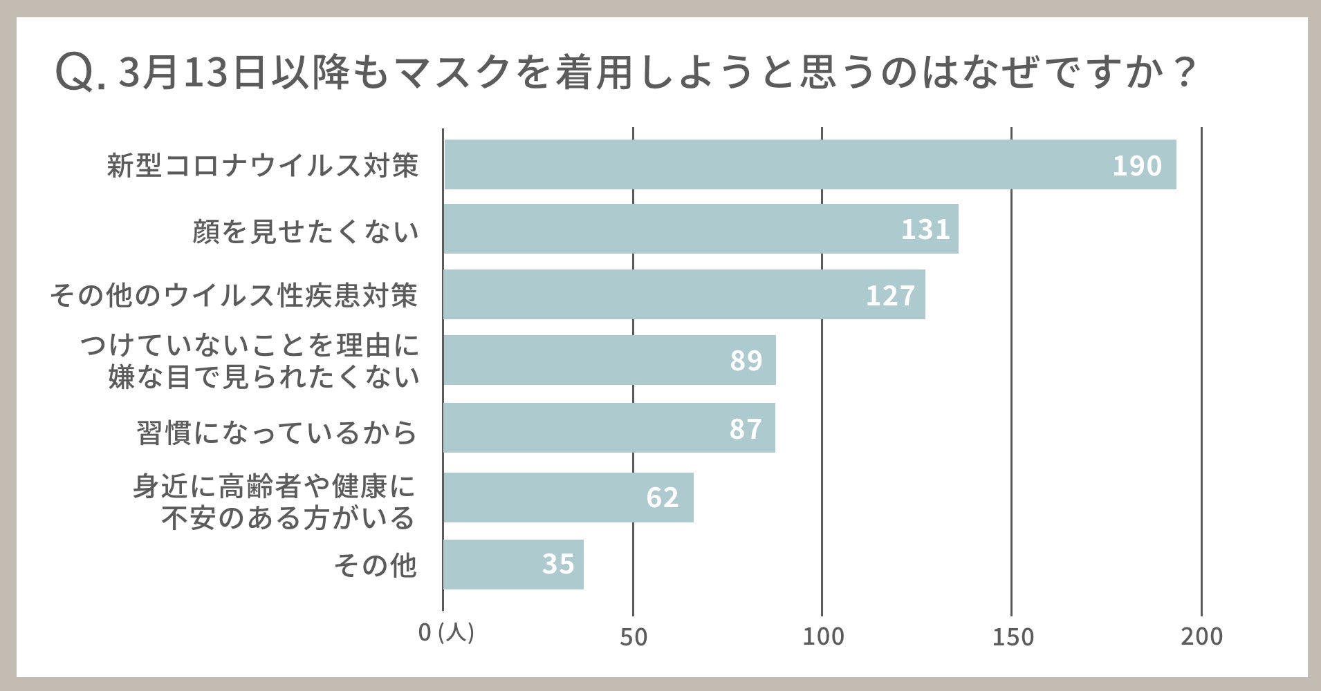 一方「その他のウイルス性疾患対策」が127人とインフルエンザを気にする人もまだ多く、以下「つけていないことを嫌な目で見られたくない」89人、「習慣になっているから」87人、「身近に高齢者や健康に不安のある人がいる」62人という結果になりました。