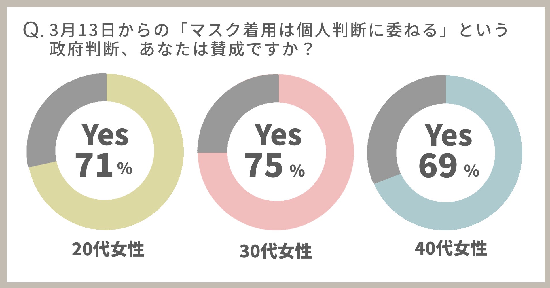 そこで、20代~40代の女性に「3月13日からの“マスクの着用は個人の判断に委ねる”という政府判断、あなたは賛成ですか?」とアンケートでお尋ねしました。