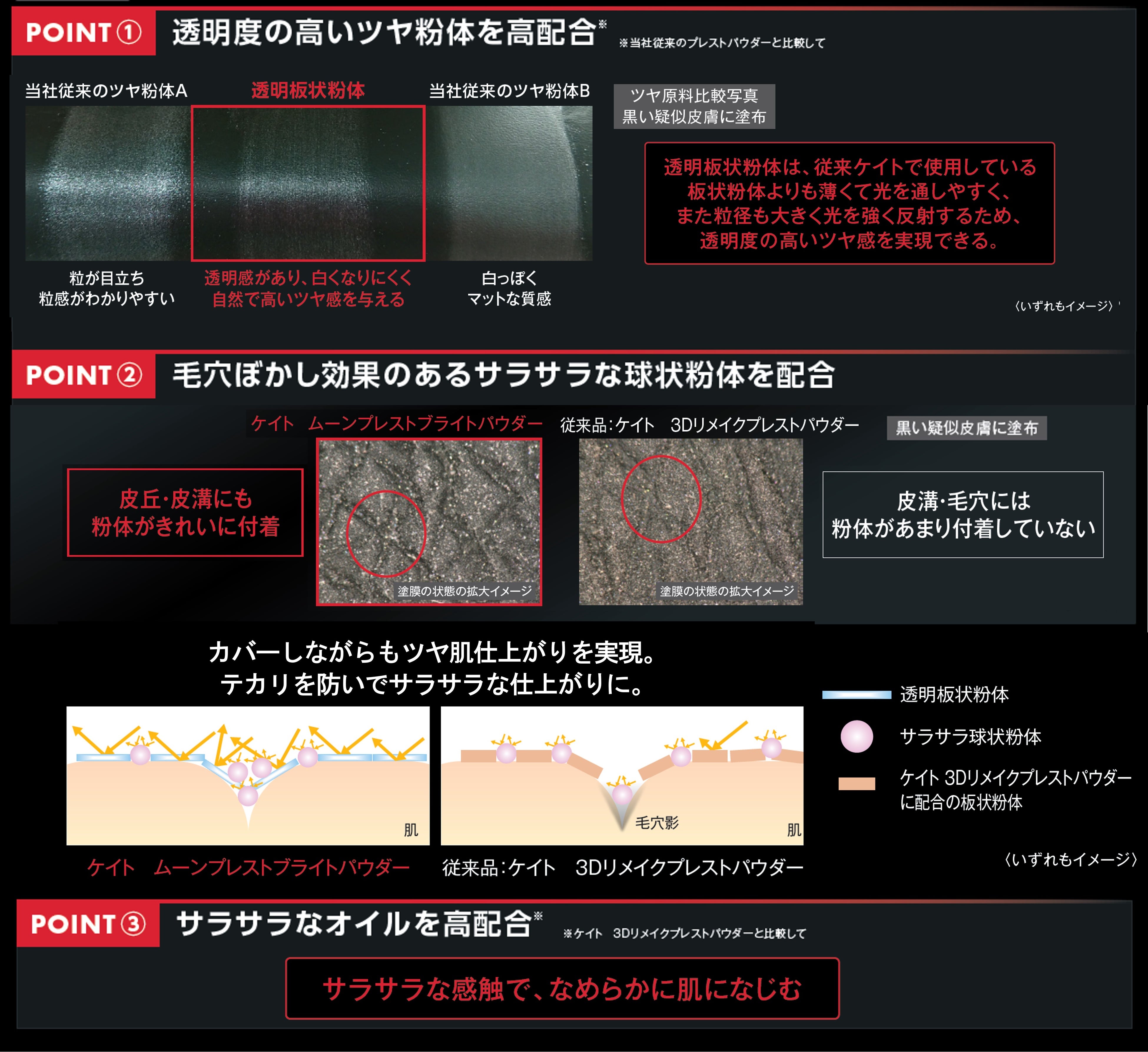 テカリを長時間防いで、毛穴・凹凸をなめらかにカバー。サラサラなのに、月あかりのような澄んだツヤ肌仕上がりを実現。