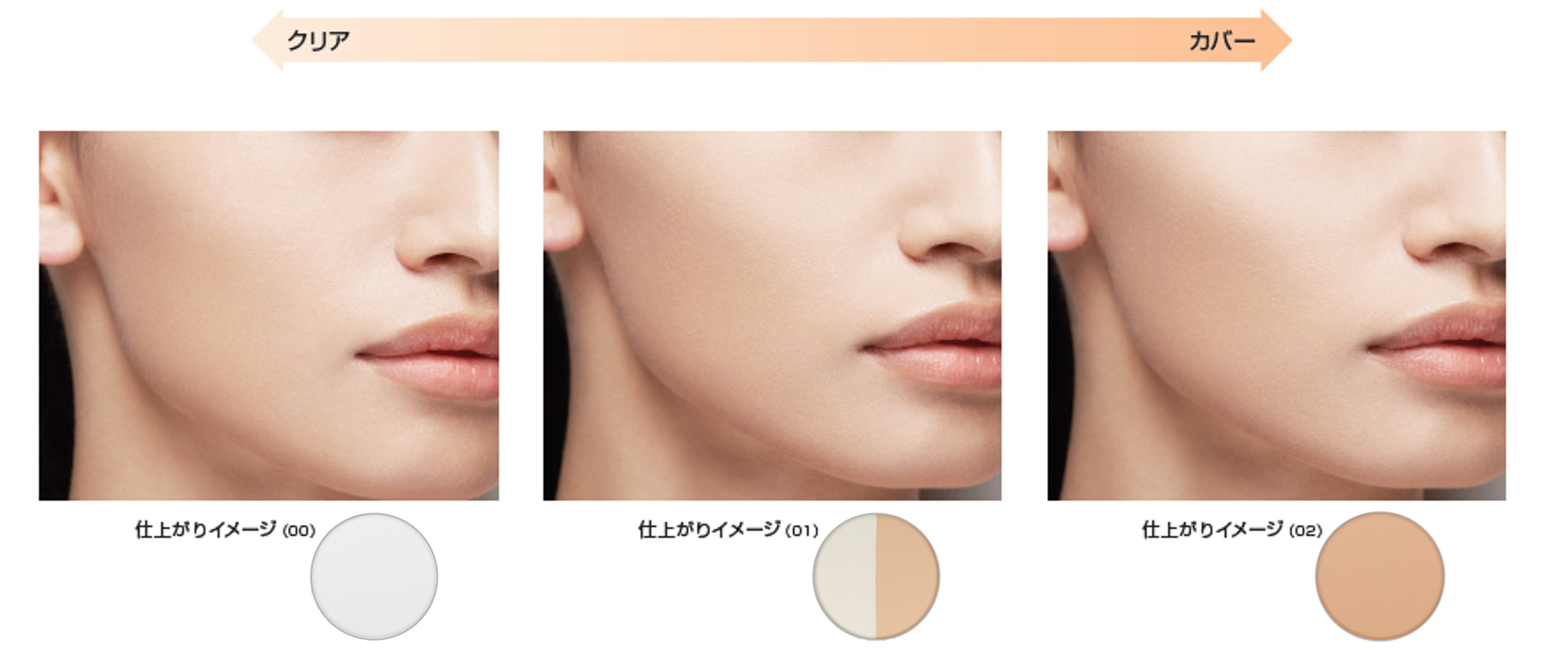 光の効果でカバーしながらも透明感のあるツヤ美肌仕上がりに。00は毛穴・凹凸カバー効果、01、02は毛穴・凹凸カバー・色ムラカバー効果。