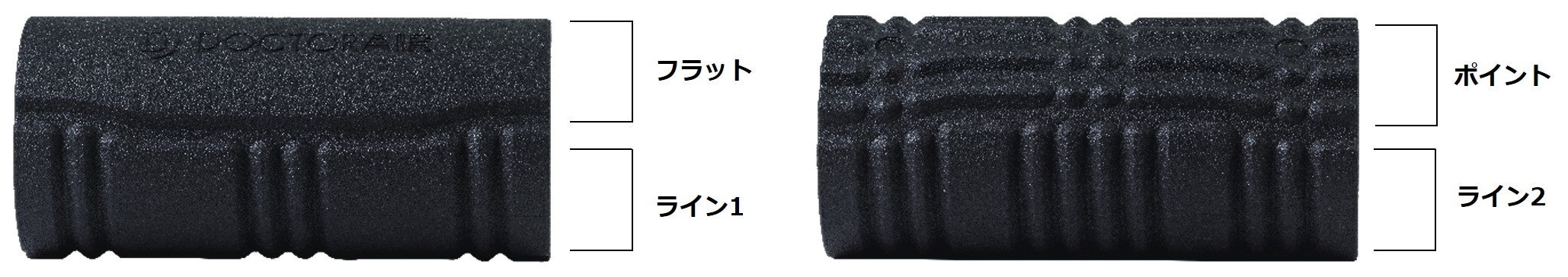 【ストレッチロール3】は凹凸がなく刺激が少ない〔フラット〕、筋肉量にあわせて刺激を変えられる2種類の〔ライン〕、より強い刺激を加えることのできる〔ポイント〕の計4面のグリッドデザインを組み合わせることで使用部位や好みの振動刺激に合わせて使い分けが可能です。