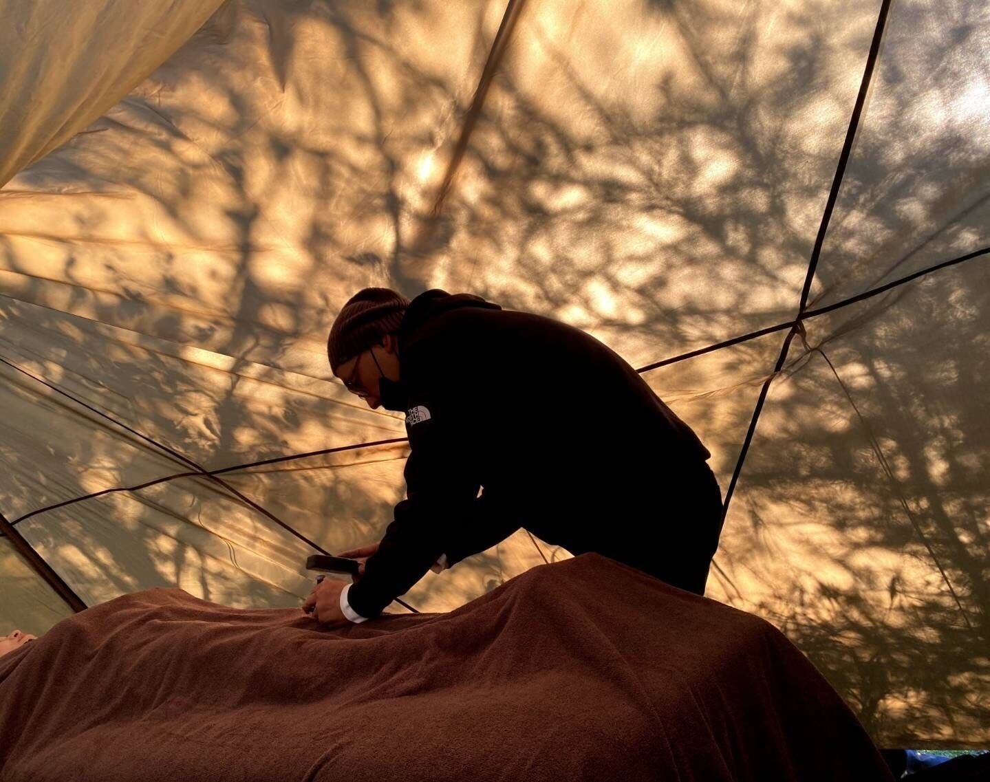 自然の中で施術場所を探し設営するには、風向き、日差し、虫、危険物の有無も考慮しなければなりません。時間帯によって気温や日差しの向きが刻々と変化していくため、アウトドアの知識も必要です。