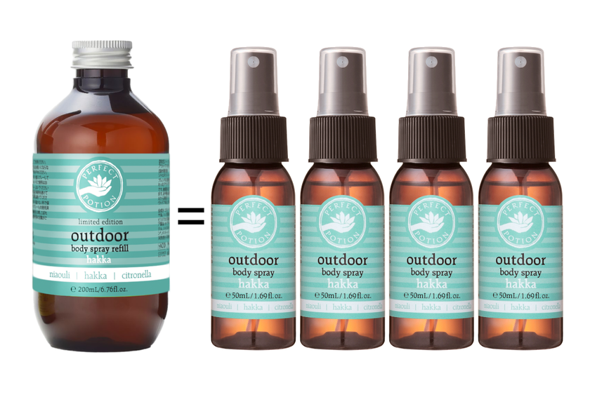 リフィルボトルは、容量200mLで、「アウトドアボディスプレー ハッカ」の持ち運びに便利なサイズの50mLボトル4本分となります。