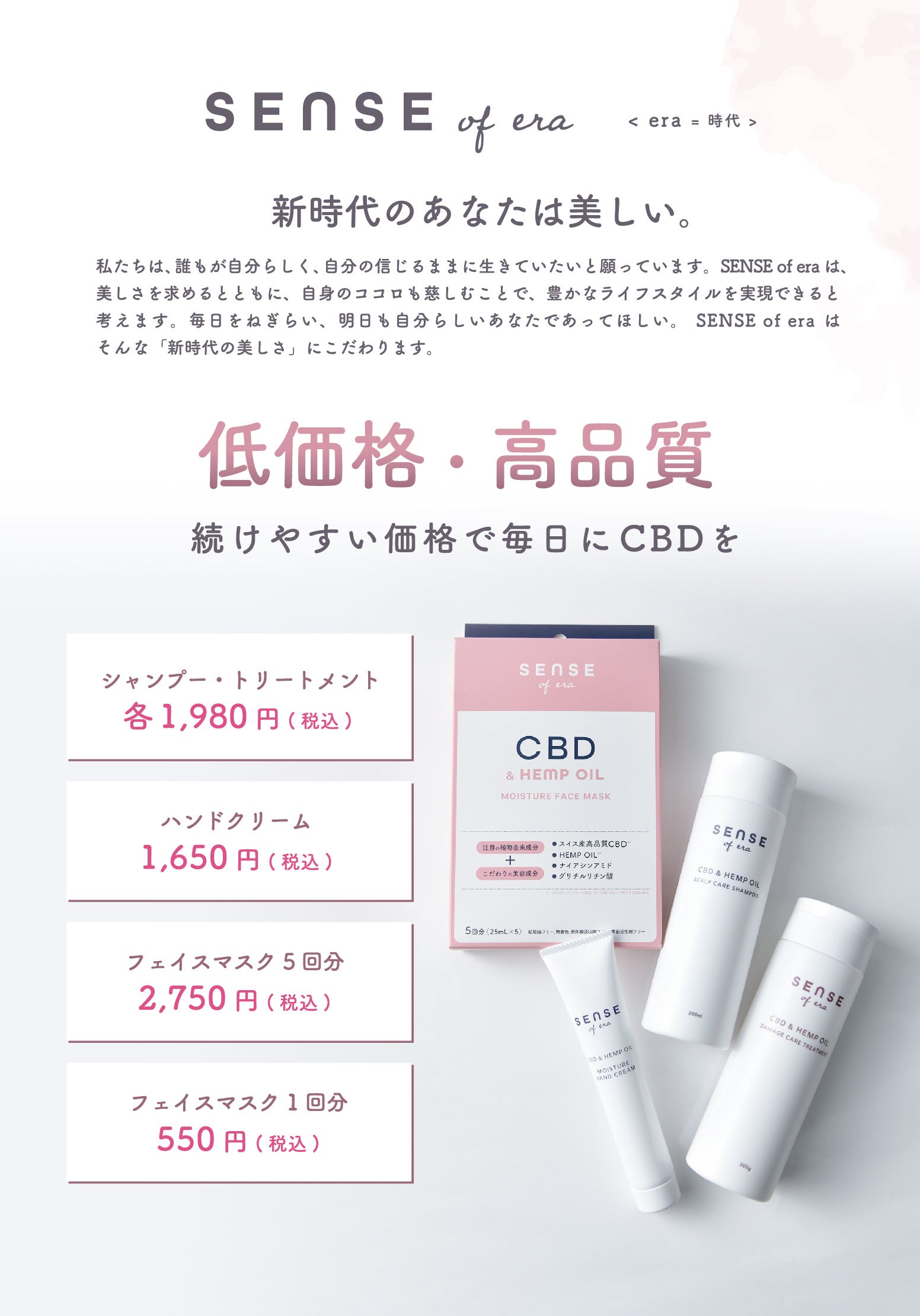 今世界が注目する植物性由来のCBDとこだわりの美容成分をミックスした、新時代の美容習慣「SENSE of era」の1stラインアップ、シャンプー、トリートメント、ハンドクリーム、そしてフェイスマスクが株式会社金鶴(所在地:東京都世田谷区)の公式ECサイトにて販売開始となりました。