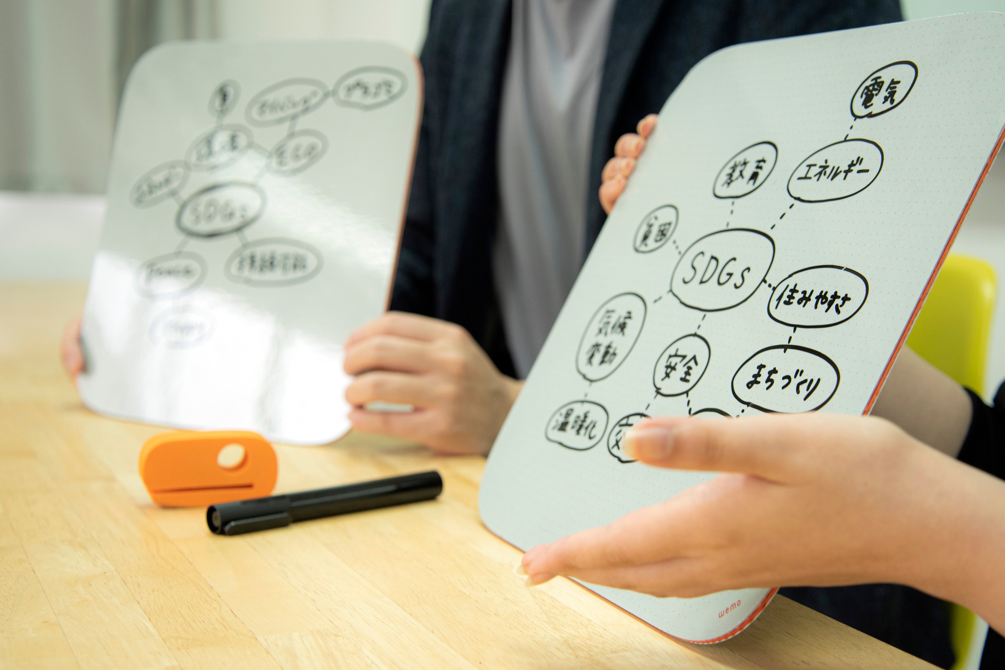 「いつでも どこでも かける おもいだせる」をテーマに、記憶に対する物理的/精神的なストレスを軽減する発想から生まれたプロダクト、それがwemo!油性ボールペンで書いて消して、何度でも使えるサスティナブルなウェアラブルメモです。書いた文字は濡れても消えないため屋外や水中での作業にも使用できます。目的やTPOに合わせて様々な製品タイプをご用意。2018年の”日本文具大賞 機能部門 優秀賞”、2021年の“日本文具大賞 デザイン部門 グランプリ”などを受賞し、発売以来累計90万個を販売しています。
