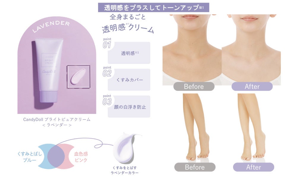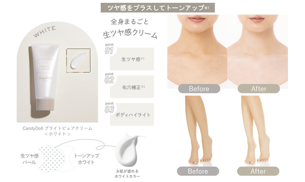 誰でも白肌(※1)を叶えるCandyDollのブライトピュアシリーズから、SPF値がUPした、1本で紫外線カットもトーンアップ&肌補正(※1)もできるボディ用トーンアップUVと、ブランド初の薬用タイプで素肌からの美白(※2)ケアが叶う全身用ケアクリームの2商品が登場します。