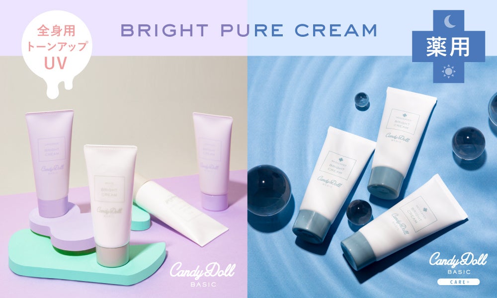 誰でも白肌(※1)を叶えるCandyDollのブライトピュアシリーズから、SPF値がUPした、1本で紫外線カットもトーンアップ&肌補正(※1)もできるボディ用トーンアップUVと、ブランド初の薬用タイプで素肌からの美白(※2)ケアが叶う全身用ケアクリームの2商品が登場します。