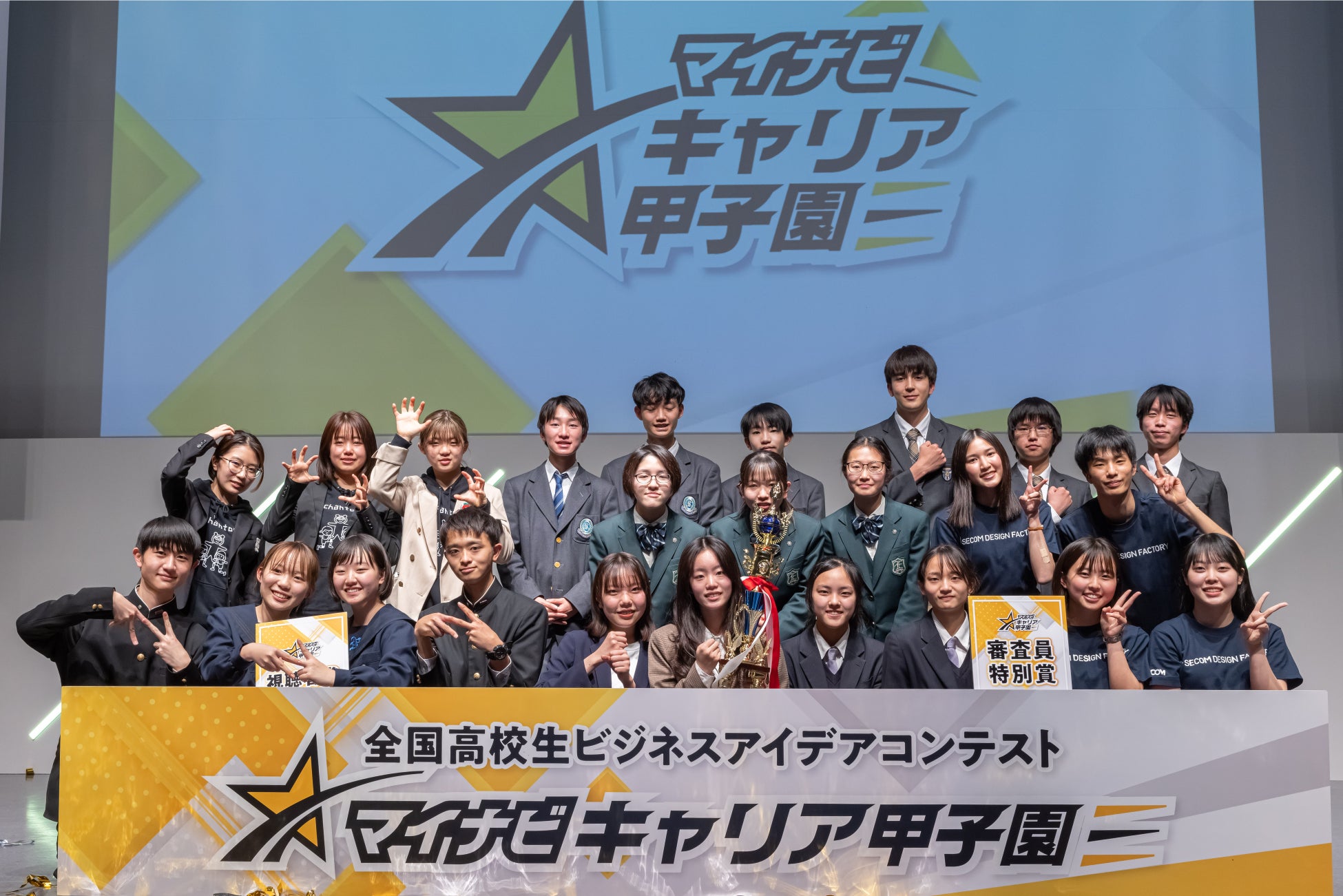 マイナビキャリア甲子園は、高校生が2人から4人でチームを組んで課題解決に挑む、ビジネスコンテスト型探究学習プログラム。9年目の開催となる今年度は、全国から過去最高の8,959名、2,318チームの高校生が参加。大会テーマである「NEXT GATE」をもとに、8つの協賛企業・団体がそれぞれのテーマを設定。書類審査・動画審査・準決勝大会を勝ち抜いた高校生は、決勝大会へ進出し、半年以上かけて考え抜いたアイデアを1チーム10分以内で披露。決勝大会の様子はインターネット生中継され、総合優勝チームは100万円分無期限海外旅行券を手にすることができます。