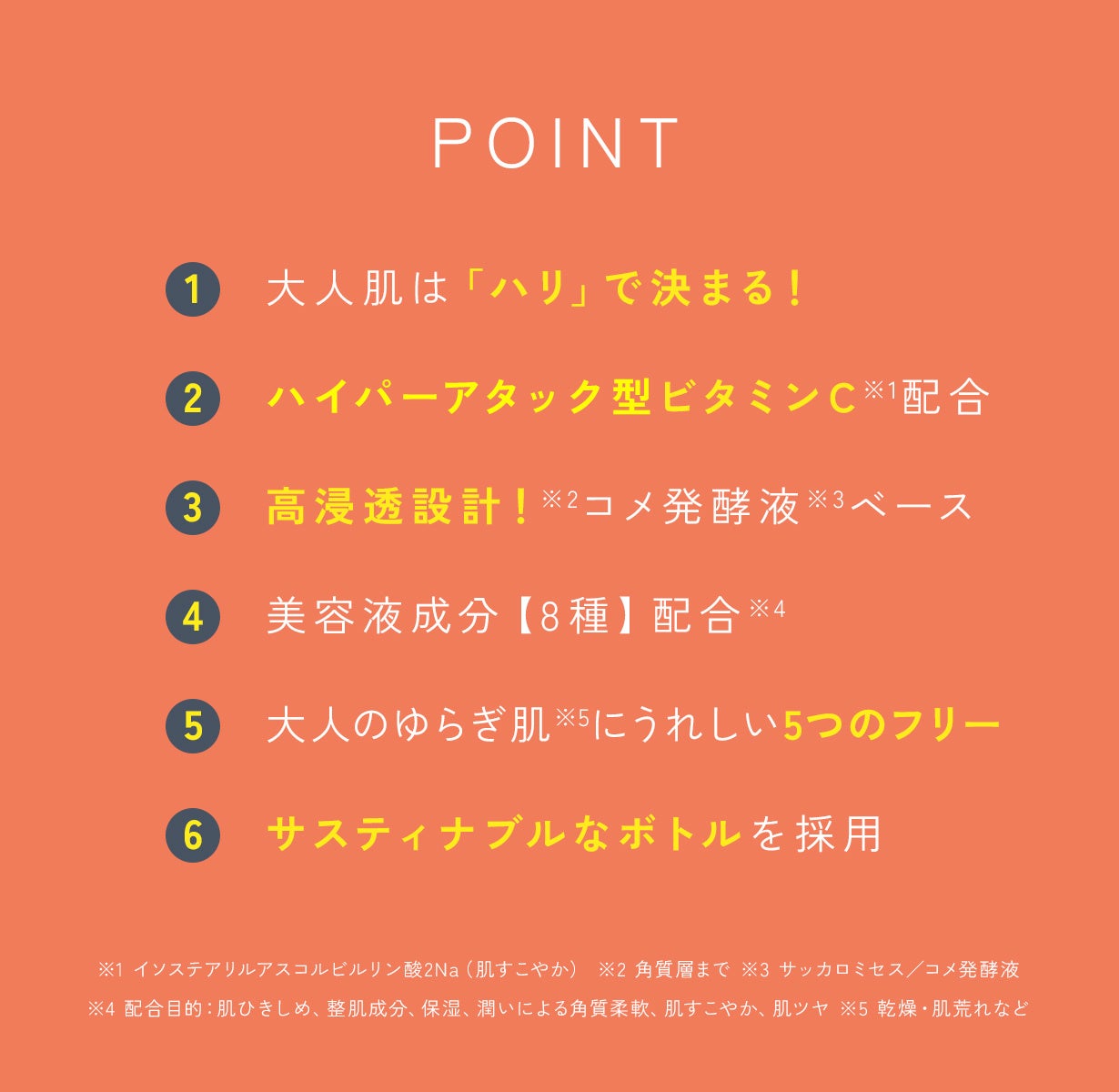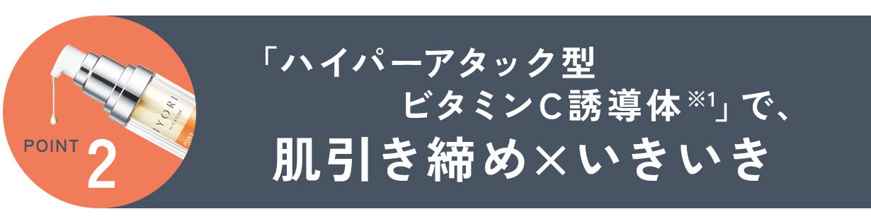 「ハイパーアタック型ビタミンC誘導体※1」をたっぷりと配合。角質層への浸透性が高く、1つの酵素で効率よくビタミンCを供給します。お肌をきゅっと引き締め、いきいきとした印象に。