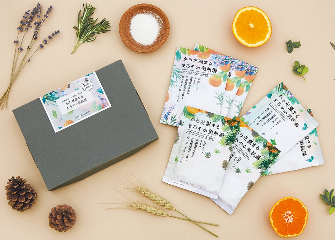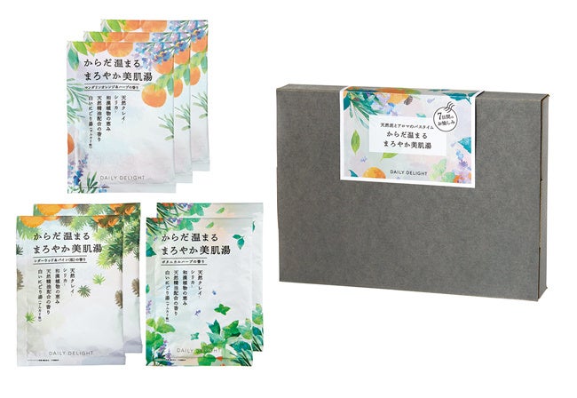 バスパウダーが7包入ったバスギフト。「デイリーディライト まろやか美肌バスパウダー」は、天然クレイ(ベントナイト:吸着、整肌成分)、シリカ(吸着成分)、和漢植物(保湿成分)を配合したやわらかなアルカリ性の美肌湯入浴料。立ちのぼる湯けむりにはハーブのアロマが漂います。
