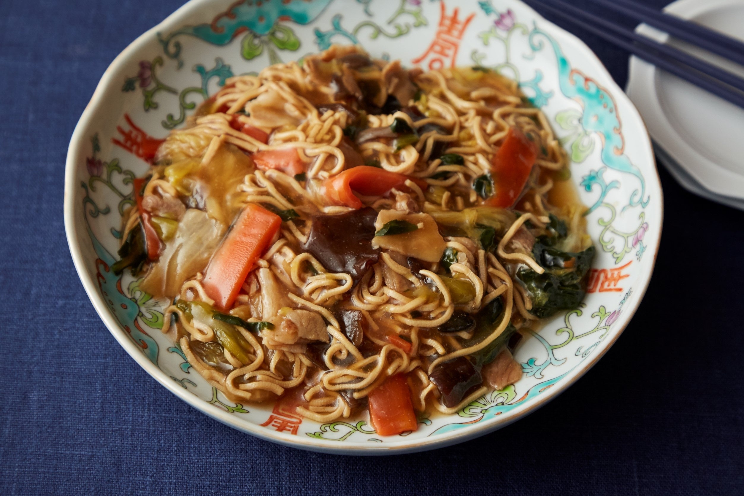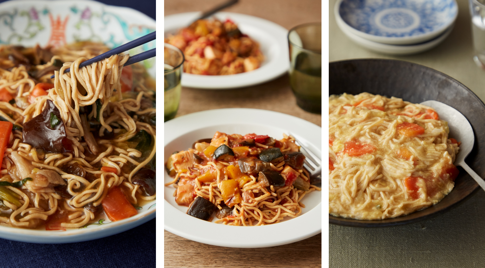 中華圏の伝統食材である豆腐干を、相性ぴったりの中華あんかけで絡め、食べ応えも十分のあんかけ焼きそば風に仕上げました。豆腐干に馴染みがない方でも食べやすい、醬油ベースで味付けしています。