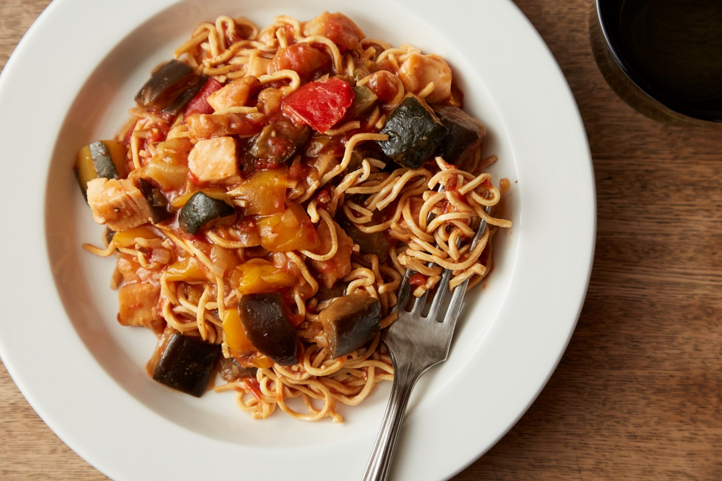 ズッキーニ、茄子、赤パプリカ、黄パプリカなどのビタミン野菜と、