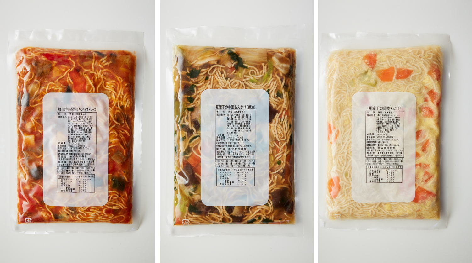 今回、ビュッフェやお弁当の一品として、外食・中食においてよりご活用いただきやすくするため、これまで解凍が必要だった豆腐干の調理の手間を大幅にカットし、簡単なオペレーションで調理が可能な「豆腐干のグリル野菜とチキンのトマトソース」、「豆腐干の中華あんかけ(醤油)」、「豆腐干の卵あんかけ」の和洋折衷3種類の冷凍惣菜を開発いたしました。豆腐干は、100g あたりの糖質量が 1.8g、 たんぱく質量が鶏ささみ肉と同等の 23g と優れた栄養特性を持ち、バランスのとれた健康的なメニューの提供にご活用いただけます。
