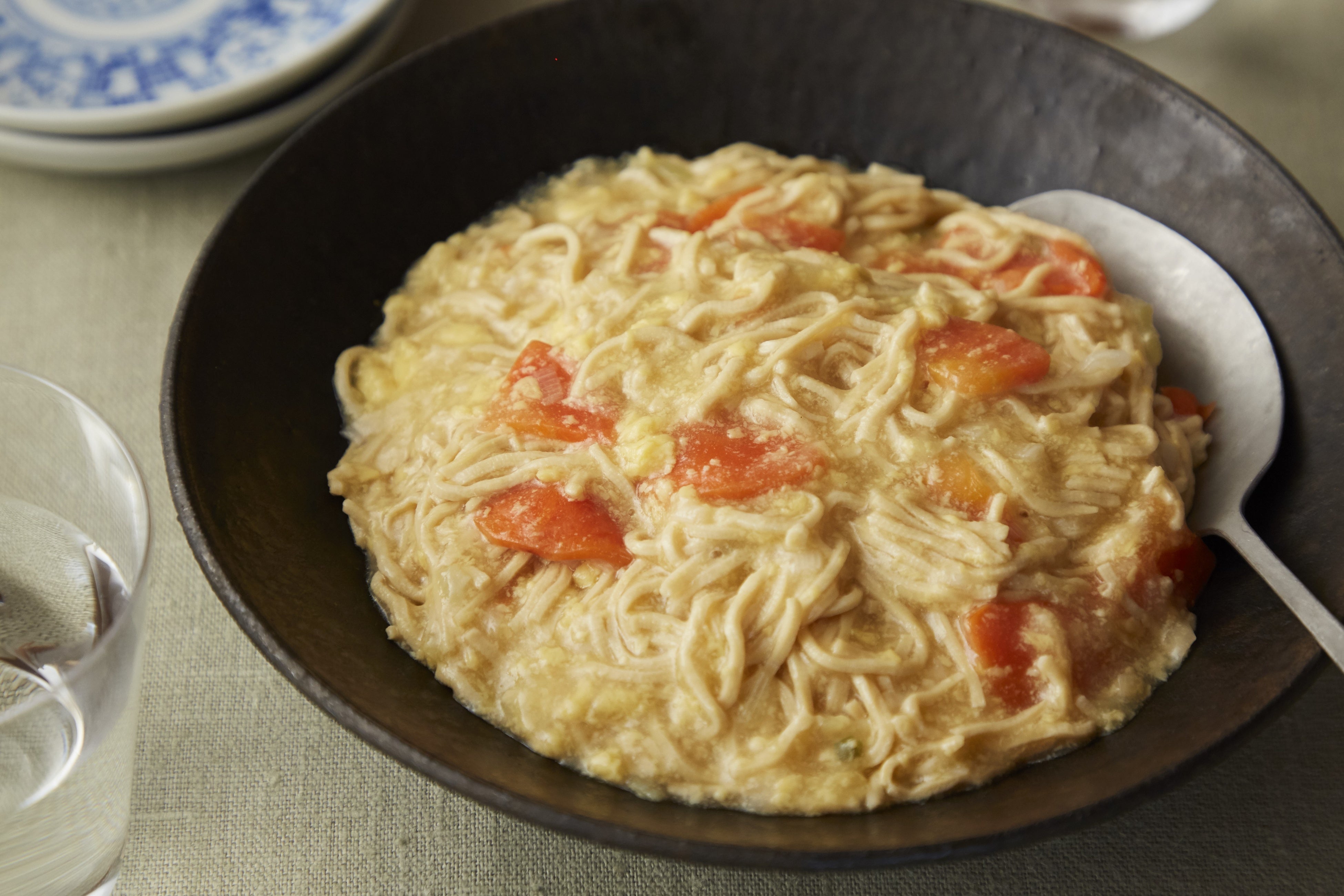 トマトパスタ風の一品です。優食の豆腐干は表面に凹凸加工が施されているため、ソースとよく絡むこともポイントです。