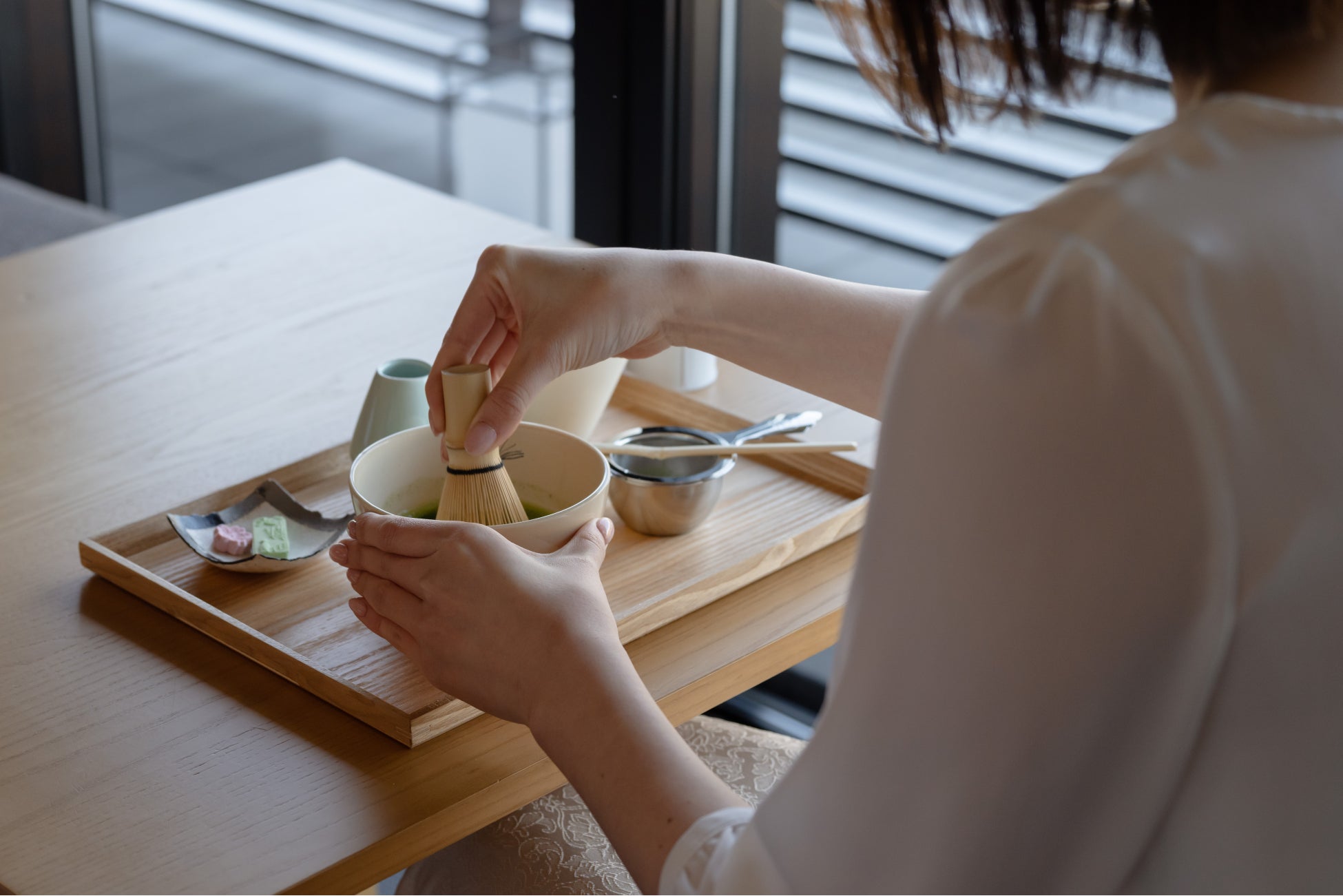 一服の後には、京都らしさや季節を感じていただける干菓子をご用意。一保堂茶舗のレクチャーを受けたホテルスタッフが、気軽に美味しく味わえる抹茶の点て方をご案内いたします。