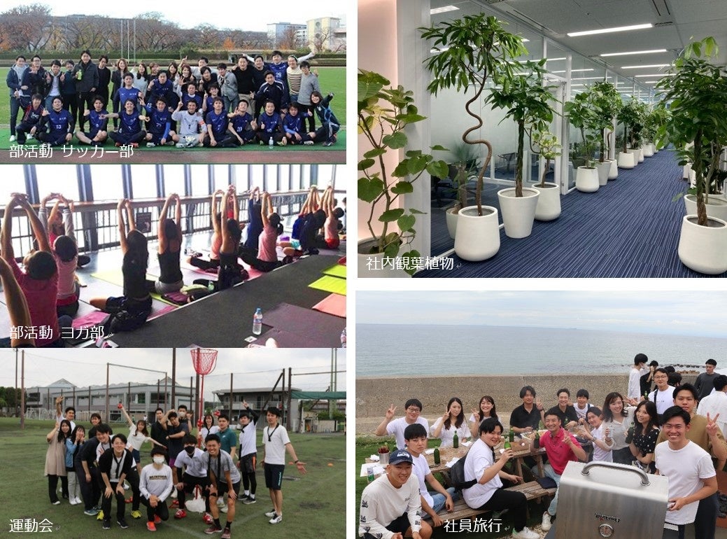 ・部活動補助制度。サッカー部、ヨガ部、ゴルフ部、ダンス部、野球部、マラソン部の6団体があり、一部費用を会社が補助。