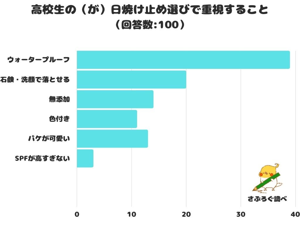 高校生の(が)日焼け止め選びで重視することをアンケートにて調査したところ、1位は「ウォータープルーフ」 でした。