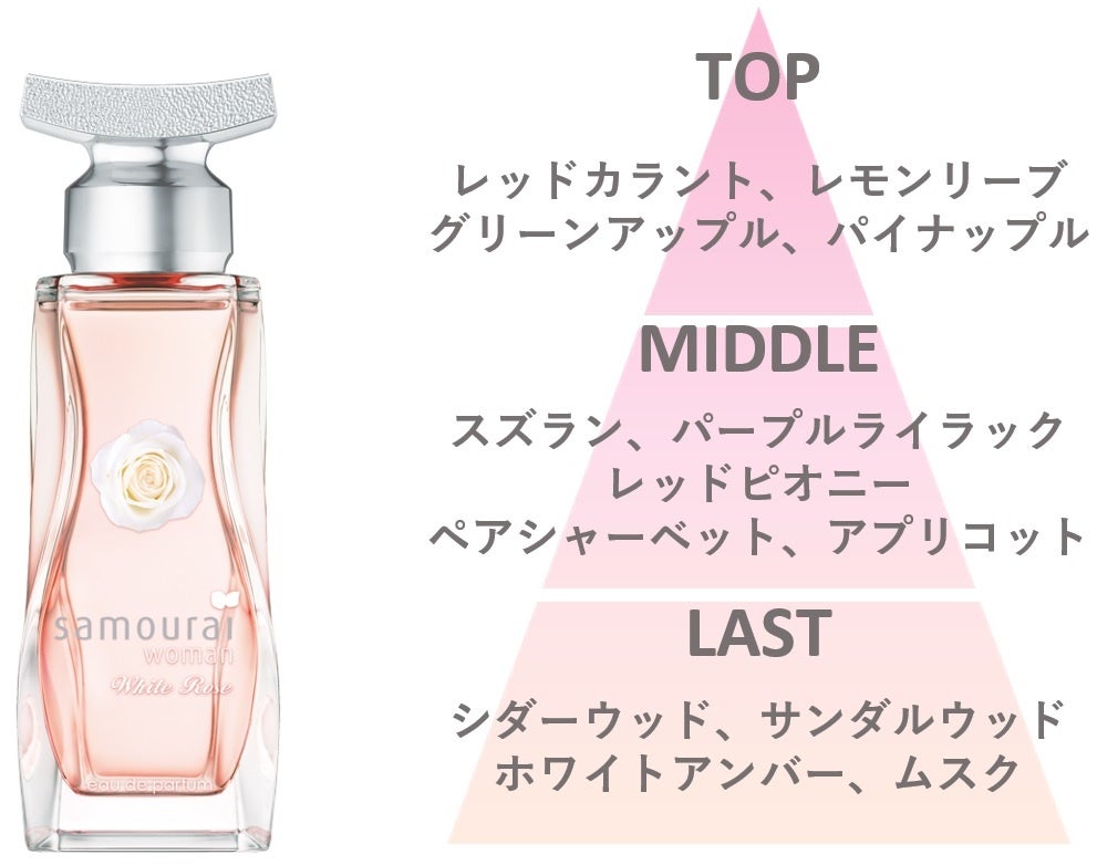 フローラルの香りが幾重にも重なる、優しく可憐な「サムライウーマン ホワイトローズ」の香り
