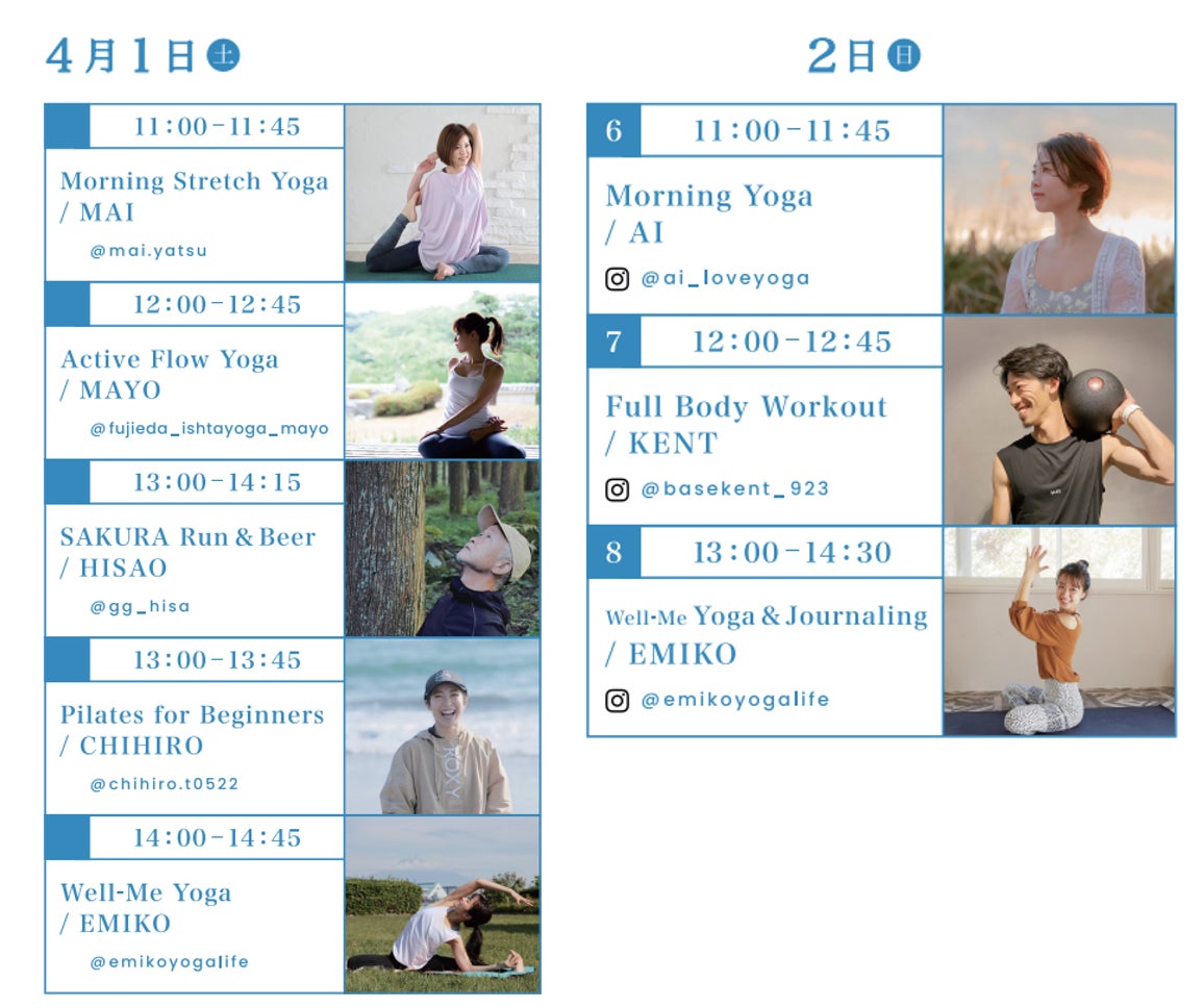 今回はフィットネスイベントとしてYOGA・RUN・PILATES・WORKOUT の魅力的な講師にお集まり頂き、2 日間で 8 クラスを 開催。経験や年齢に関係なくご参加頂けます。空の下で気持ち良く 体を動かしましょう。